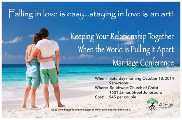 Two Conferences to be hosted by Better Life Counseling Center Better Life Counseling Center is hosting two conferences next week, one for singles and one for married couples. How to Avoid Falling for a Jerk or Jerkette will be held on Friday Oct. 17, 6-9 p.m. at the Forum, 315 E. Monroe. The cost is $20 per person or $10 for college and high school students with ID. Keeping Your Relationship Together When the World is Pulling it Apart Marriage Conference will be held on Oct. 18, 9 a.m.-Noon, at Southwest Church of Christ, 1601 James Street. The cost is $45 per couple. To register or to print a registration form to mail in, go to betterlife.org. [+] add comment |