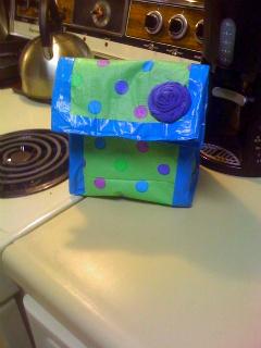 Little Hands' No-Sew Lunch Box I had another post topic in mind today, but...it has rained a lot, cancelling out the fun we were going to have that I was going to blog about. I thought I'd share, instead, London's little lunch bag that she takes to a babysitter once a week. I found the oilcloth tablecloth at a thrift store brand new for $1. I wish I had a tutorial for this, but I forgot to take pictures along the way. Luckily, you can google this and find several websites with instructions including Martha Stewart's site. I cut two long pieces and four shorter ones for the sides. I didn't want to deal with the slipping around, so I actually put a little hot glue on the back of each piece and put them together so the nice side was facing out on both sides. I then folded the long piece and sewed on the sides. However, my sewing machine was having serious issues and I ended up getting a new one, but at the time, I was stuck. SO, I pulled out the cute turquoise duck tape that I have, and seriously just duck taped over the places that needed to be sewed. I made a little blue rosette out of a tshirt scrap and hot glued it on as well. Last, I took some Velcro and put it inside to make the bag close while standing up, and then another two pieces on the front to make the bag fold down and close. Ta da! No sew lunch bag for $1! Happy Mother's Day this weekend! Maybe the rains will stop soon, and I'll get to share a day of School's Done, Summer Fun! celebrations! Or, we'll just call it, Yay! a Sun! party. hehe