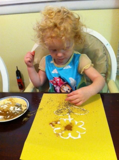 Sensory Play with Little Hands I'm a big fan of sensory play. I big fan. Sensory play is basically just a way for your children to play that uses as many of a child's five senses as possible to learn. It takes some searching for new ideas and a lot of intentionality, but it's worth it. We're in the middle of the midsummer time blues. Do you have those at your house? You start out the summer strong with lots of fun and play, but somewhere along the way, it gets hot and boring. I never realized how important holidays are to young children to keep things changing, until summer and the lack of holidays. There's Independence Day, but when they're really little, it's hard to make that a big deal. Trust me, my history minor will come out strong every July when they're older. However, in this arts and crafts loving house, the back to school supplies going on sale is very much like a holiday! In comes the sensory play. We went to Walmart yesterday and stocked up on the art supplies that have slowly dwindled down over the last several months. We keep a low cabinet in the kitchen full of washable paint, safety scissors, pipe cleaners, tape, and anything else that the girls could use to create. Today, London wanted to use our new Elmer's glue, and I wanted to include as many senses as possible. We've all made a picture on paper out of glue to sprinkle on glitter and shake off, but I wanted it to be a little different. I have a large number of cheap cooking spices that I use for stovetop potpourri, so I took out four of them and sprinkled a little of each on saucers. I drew some flowers on paper for them, and let them sprinkle the spices on to the glue. It was neat to watch them smell and taste each to decide which one they liked the most. They weren't fans of the taste of any, of course, but cinnamon and Italian seasoning were their favorite smells, which I was surprised on that last one. The other two I used were nutmeg and ginger. Next I wrote their names on new pieces of paper and let them mix all the spices together to sprinkle on. It was really fun and easy clean up. After they were done and on their way to play, I just shook all the leftover spices into a small pot to add vanilla and water and make some potpourri on the stove. Easy peasy. My 22 month old actually understood much better than I expected, and she was really good at this activity! One tip: keep baby wipes close at hand. If they rub their eyes, those spices don't feel so great in the eye. But even when my 3 year old got it in her eyes, I wiped her eyes with a wipe and she was happy again!
