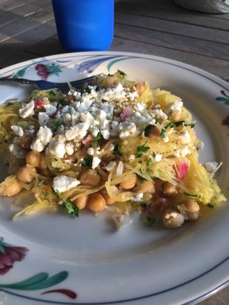 The Cardiologist's Wife - Spaghetti Squash (with recipe!) The next time you are in the grocery store, don’t pass up the yellow oblong squash which looks a bit like a pale watermelon. When cooked, the inside flesh pulls out in long strands resembling spaghetti. This mild tasting squash is very easy to prepare and can be dressed up in endless ways. Though spaghetti squash is often recommended as a substitute for pasta in a marinara sauce, it is so much more versatile than being a stand in and you are missing out if you haven’t tried it any other way. Spaghetti squash is low in carbohydrates, rich in antioxidants and several minerals. A one cup serving contains 40 calories and almost 10% of your daily needs for vitamin C , 9% of fiber plus several B vitamins, potassium and folate. It also contains a fair amount of omega-3 and omega-6 fatty acids which have been shown to be beneficial for preventing inflammation that causes heart disease, arthritis and certain cancers. The following recipe is great as a main dish or can work as a side dish with just about any meat. My husband and I ate it last night as a main dish and found it satisfying and filling. We have made a commitment to eating more vegetarian meals as a way to improve our overall health. It’s important to remember that the foods we eat can either contribute to good health or poor health; the decision is yours which type you pick. Spaghetti Squash with Chickpeas and Feta 1 3lb. squash Using a large knife, halve the squash lengthwise, scrapping out seeds. Place both halves cut side down in a microwavable dish, adding a splash of water. Microwave 9 to 11 minutes or until tender. Let cool a few minutes, then flip over and use a fork to shred squash into strands. Set aside. While squash cooks, toss onion, lemon juice and a pinch of salt and pepper in a small bowl. Set aside. In a large skillet, heat 1 Tbsp. olive oil. Sauté garlic until just beginning to brown, about 2 minutes. Add chickpeas, cook two minutes more. Add squash, onion mixture, parsley, remaining olive oil, salt and pepper. Toss well to mix and coat. Add a bit more lemon juice if desired. Top with feta before serving. Yields 4 servings with 245 calories, 10 grams of fat, 7 grams of protein, 27 grams of carbohydrates and 8 grams of fiber per serving. Also try roasting the halves of the squash in the oven for a richer, caramelized flavor. Simply brush the halves with olive oil, salt and pepper to taste. Roast at 400 for about 45 to 50 minutes. Sauté 1 shallot, minced with 2 cloves of garlic minced in some olive oil. Toss with the cooked squash and sprinkle with some freshly grated parmesan cheese. [+] add comment |
