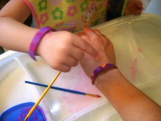 Making Wooden Bracelets for Little Hands Hope everyone is enjoying the sunshine and taking advantage of it this week! Today's craft actually happened a few weeks ago during all the rain, but it was so cute that I wanted to share. I've seen it online before, but decided to try it. We made some wooden bracelets! I boiled a few popsicle sticks for about 30 minutes, and then once they were saturated, I began slowly bending them until they would fit into the rim of a small juice glass. I broke several, but eventually, I had a few bent and smoothed enough to fit inside the glass where they sat overnight to dry. Once they were completely dry, we painted them a white to prime because we were using thin very washable paint from Crayola. After they were dry, we painted them more and added details. I wanted to add glue drops with a toothpick and glitter, but I decided we'd wait on that until the girls were older. I eventually hot glued a tiny piece of elastic to each side of London's bracelet because even using the tiniest juice glass we had, it was still a little big for her wrist. I was actually impressed that it worked so well, though I did have to dip it back in the warm water after manipulating and bending it each time. All in all, the warping took about 5 minutes, so other than the waiting, this fun craft will only take about 10 minutes painting and warping! Well worth an afternoon craft time.
