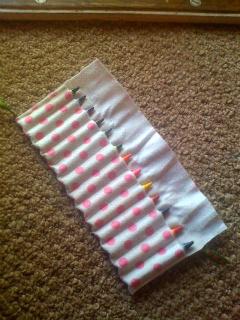 Little Hands: Getting Crayons Under Control Hi everyone! We've been having a crayon problem in our house. A problem, in that London leaves them out, and Story wants to eat them. So I've been trying to figure out something to keep her crayons better organized, and then, I came across an idea to make a roll up felt holder. It's made with just one piece of felt you get at Walmart or Hobby Lobby, a few sewing stitches, and a piece of ribbon. I usually try to avoid sharing sewing things here, because though I am certain nothing I share will ever be out of the beginner level, not everyone sews. In my usual routine, I first tried to hot glue instead of sew, but...it was a disaster. Don't waste your felt. I folded one of the length sides up a little shorter than a crayon, and stitched up both sides. Then, I measured one inch lengths all the way down and stitched pockets for the crayons on all my marks. I cut the top that I folded down onto the crayons in a bit as well. Finally, I stitched on some ribbon to tie it all up. My daughter's so into it that she actually puts her crayons up, and the baby can't find pretty colorful chew toys lying around. My favorite parts about this? It took just a few minutes, it doesn't require great sewing skills, a piece of felt is $.46 or 2 for $.46, and ribbon can be bought for super cheap too. Because of back to school sales, crayons and notebooks are on sale everywhere, and I'm stocking up! What a great birthday/Christmas gift idea for preschoolers! Especially a preschooler in the car a lot. If you had a little time, you could even make these as party favors for a child's birthday party! Yes, it's July, but I'm already thinking of what I'll be buying/making for Christmas gifts this year like this one, so you may be seeing more posts like this in the coming months. :) (Also, please forgive my lack of photography skills. I tried taking pictures with better details, but there were always little hands (no pun intended) blocking light or needing to be cropped. :))