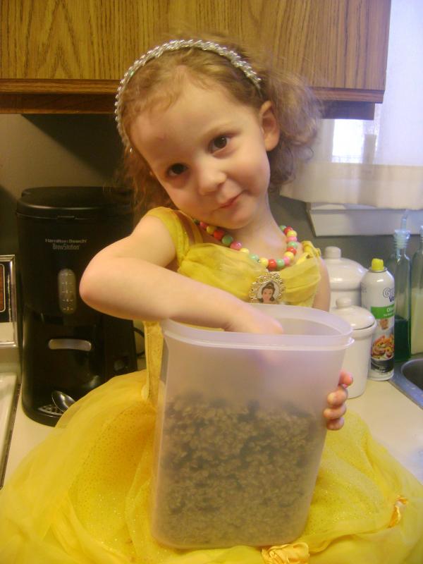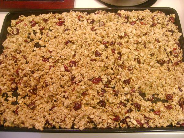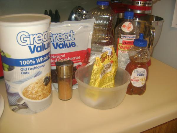 Can you tell how easy it is to make it up as you go? I obviously refused to dirty more than one measuring cup :). Mix the dry ingredients in a large bowl. This time, it was oats, flaxseed meal, cranberries, and walnuts. In a smaller bowl, mix the wet ingredients and the seasonings. This time, that was oil, honey, vanilla, and cinnamon. Pour the wet mix into the dry and mix enough to coat it all. Then spread it all onto a cookie sheet with sides (or even a cake pan) that has been lightly sprayed with cooking spray. Bake at 300 degrees for 30 to 45 minutes stirring it around every 10 minutes or so. Let it cool completely and then store in an airtight container. It will get crispier as it cools, but if you feel that it's not as crispy as you'd like once it's cooling, put it back in for a little bit more baking. You can eat this so many ways. We mostly eat it as cereal in the morning with milk, in yogurt or fruit or both (parfaits!), or just by itself! It's an easy thing to throw in a ziploc bag to take to the mall or Walmart instead of having to resort to candy or something else that is high in sugar.