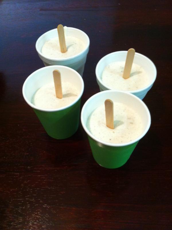 Little Hands Love Frozen Treats It's been said before on here how much my family loves frozen treats. They love ice cream the most, but mom likes the convenience and simplicity of popsicles. Our compromise has become pudding pops. I love the creaminess of them and the flexibility of flavors. They're easy to make and cheap, as well. All you need is a package of whatever pudding flavor you like, 3 cups of milk, and 2 cups of frozen whipped cream. This time, we used Oreo cookies and cream pudding for ours, but chocolate is my favorite. You mix all the ingredients and pour them into throw away cups. Stick popsicle sticks down into the middle and let them freeze. When you're ready to eat them, you peel off the cup and enjoy! They'd be a fun treat to make with your kids for an upcoming sleepover or party!